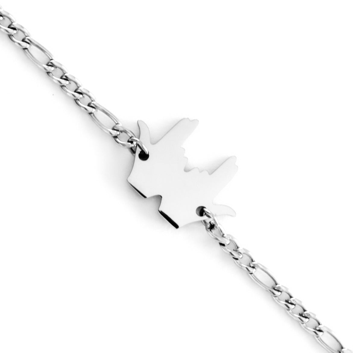 Cette gourmette en acier inoxydable affiche fièrement le signe emblématique de JUL, gravé au cœur d’un bracelet au style affirmé.